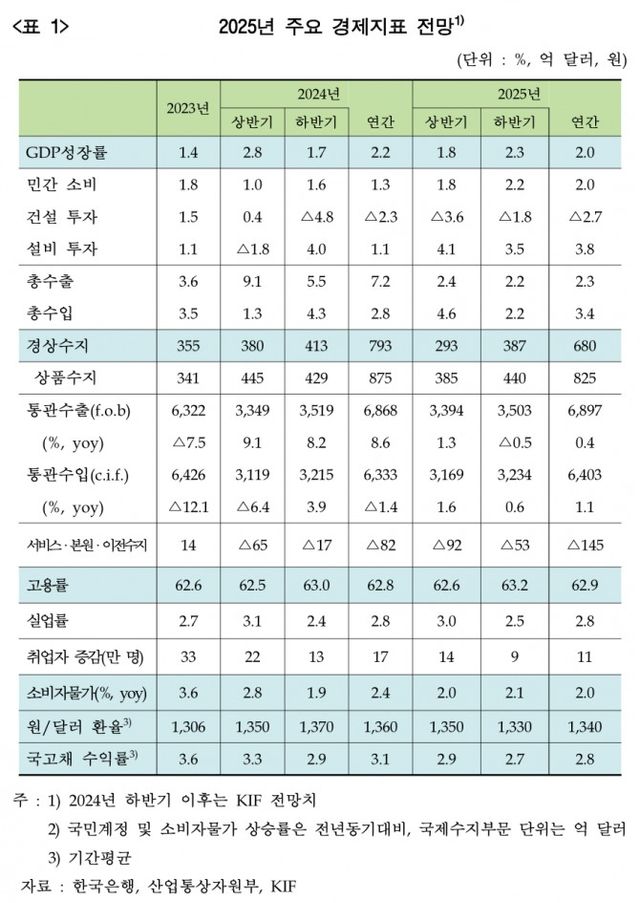 한국금융연구원은 내년 한국 실질 국내총생산(GDP) 증가율이 2.0%에 그칠 것으로 예상했다. 내수가 일부 개선될 전망이나 건설투자 부진 지속과 수출 둔화 여파로 성장세가 둔화될 것이란 분석이다. 도널드 트럼프 미국 대통령 당선인의 보호무역주의 강화로 수출 등 한국 경제에 부정적인 영향을 줄 것이라는 전망도 나왔다.