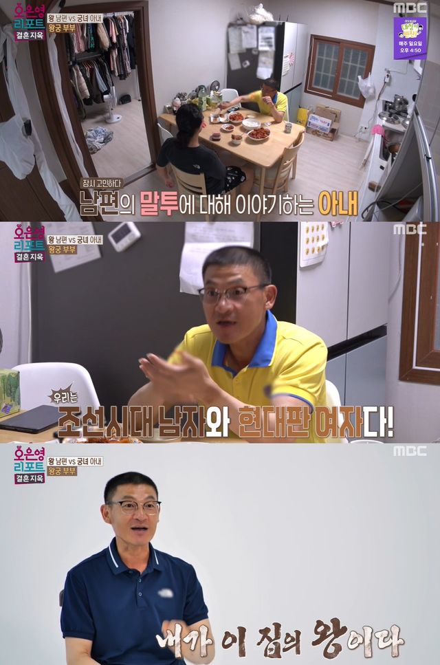 남편의 말투를 지적하던 아내는 "오빠는 왕 대접만 받으려고 하니까 문제다"고 불만을 드러냈고, 남편은 "우리는 조선시대 남자와 현대판 여자다"라며 "내가 이 집의 왕이다. 백성들을 잘 다스려야 되는데 그게 잘 안 된다"고 말했다.