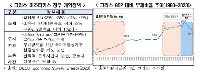 국가 디폴트 사태까지 겪었던 그리스는 최근 EU 성장률을 상회하는 경제성장을 보이며 ’OECD 2023 올해의 국가‘로 선정됐다. 80~90년대 그리스는 ‘국민이 원하는 것은 다 줘라’는 슬로건 하에 무상의료·교육, 연금 인상, 공무원 증원 등 선심성 정책을 펼친 바 있다. 이는 국가부채의 급격한 누적으로 이어져 후 그리스 재정위기의 원인이 됐다.