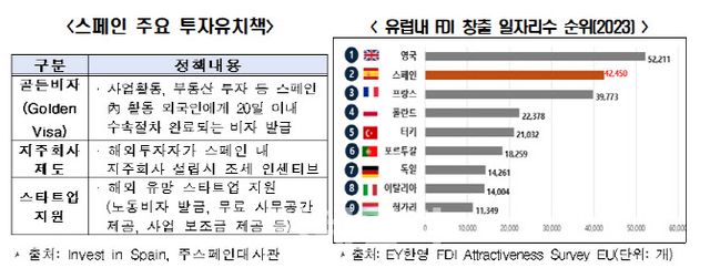 스페인은 해고조건 간소화, 단기계약 근로 도입 등 노동개혁을 통해 노동시장의 유연성을 높이고, 공공투자 축소 및 지방 재정 건전화 등 경제체질 개선을 단행했다. 또 투자이민제도인 ‘골든비자’, 해외투자자 조세 지원, 스타트업 육성 등 해외투자 유치를 위한 정책을 적극 시행했다.