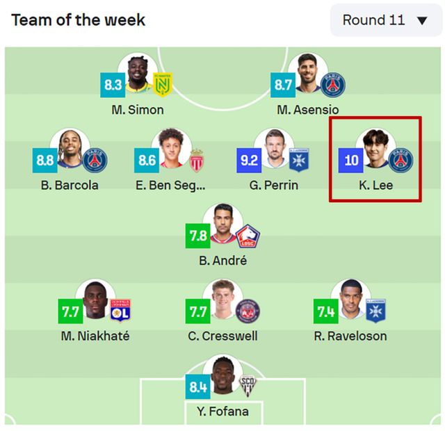 이번 11라운드 베스트11에 선정된 선수 중 10점 만점의 선수는 이강인이 유일하고, 이번 시즌 리그1 전체를 돌아봐도 10점 만점으로 베스트11에 오른 것 자체가 이강인이 처음이다. 이전까지 최고 평점은 4라운드 당시 우스만 뎀벨레(PSG), 6라운드 조너선 데이비드(릴)가 기록했던 9.7점이었다.
