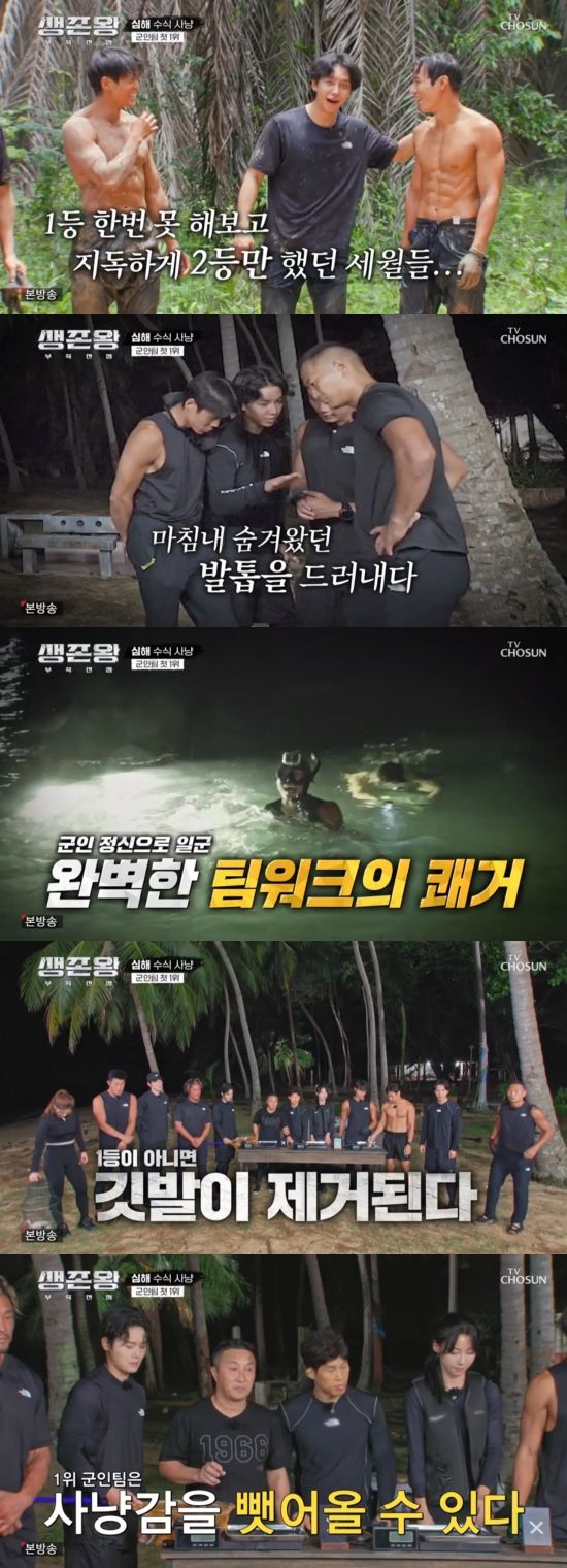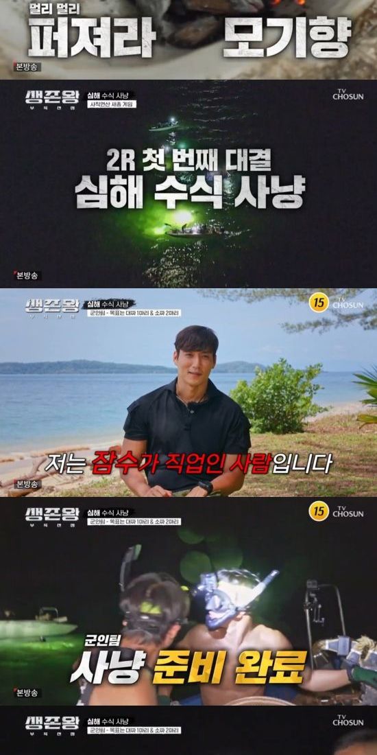 11일 방송된 TV조선 '생존왕'에서는 군인팀(이승기, 강민호, 아모띠)이 2라운드 첫 번째 대결 심해 수식 사냥에서 1위를 차지한 장면이 전파를 탔다.