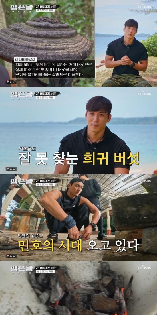 강민호는 "말굽버섯이라고 불씨를 옮기거나 향을 피우는 용도로 많이 쓰이는 버섯이다. 그 말굽버섯이 잘 안 보인다. 마침 생존지에서 주변에 뭐 있는지 정찰을 하다가 딱 한 개 발견했다"라며 전했다.