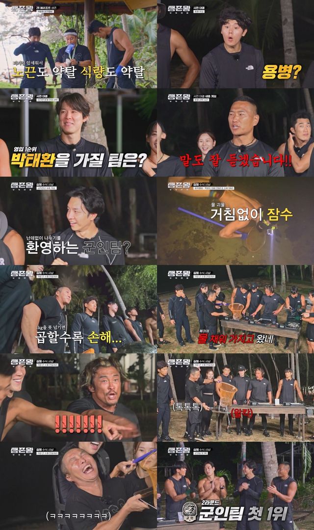 어둠이 짙게 깔린 밤바다에 각 팀당 2명씩만 물고기 사냥에 들어갈 수 있었다. 곱하기만 있는 정글팀은 “무조건 큰 걸 잡아야 한다”며 큰 종류만 찾아다녔다. ‘물 괴물’ 박태환 용병이 함께해 전력이 상승한 피지컬팀은 곱하기와 나누기를 보유해 큰 종류 2마리, 작은 종류 1마리를 목표로 탐색에 들어갔다. 군인팀은 큰 종류 1마리, 작은 종류 2마리를 목표로 했다. 가진 연산기호가 다르다 보니 모두 다른 전략으로 대결에 나섰다.