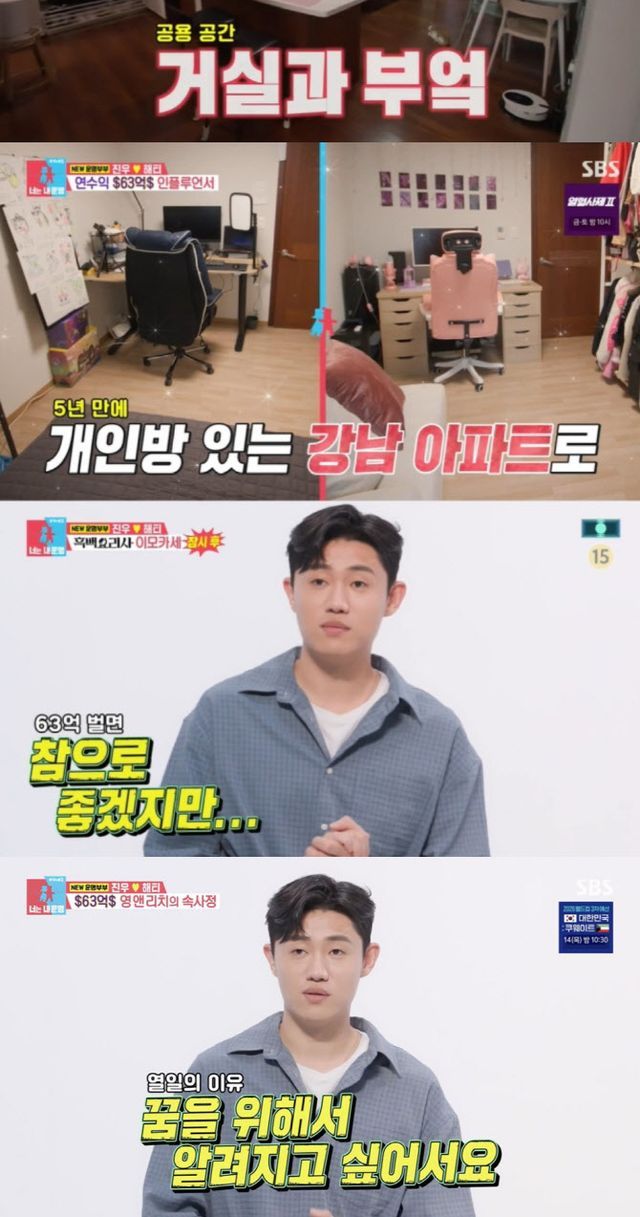 진우와 해티는 추정 연 소득 63억원에 대해서도 입을 열었다. 진우는 “63억 벌면 참으로 좋겠지만 숏폼을 롱폼으로 잘못 계산한 거다. 숏폼 수익은 롱품 수익의 100분의 1 정도”라고 답하면서도 “아직 빚도 갚아야 하고, 차도 없지만 많이 벌 때는 한 달 수입이 국산 차 정도 된다”고 덧붙였다.
