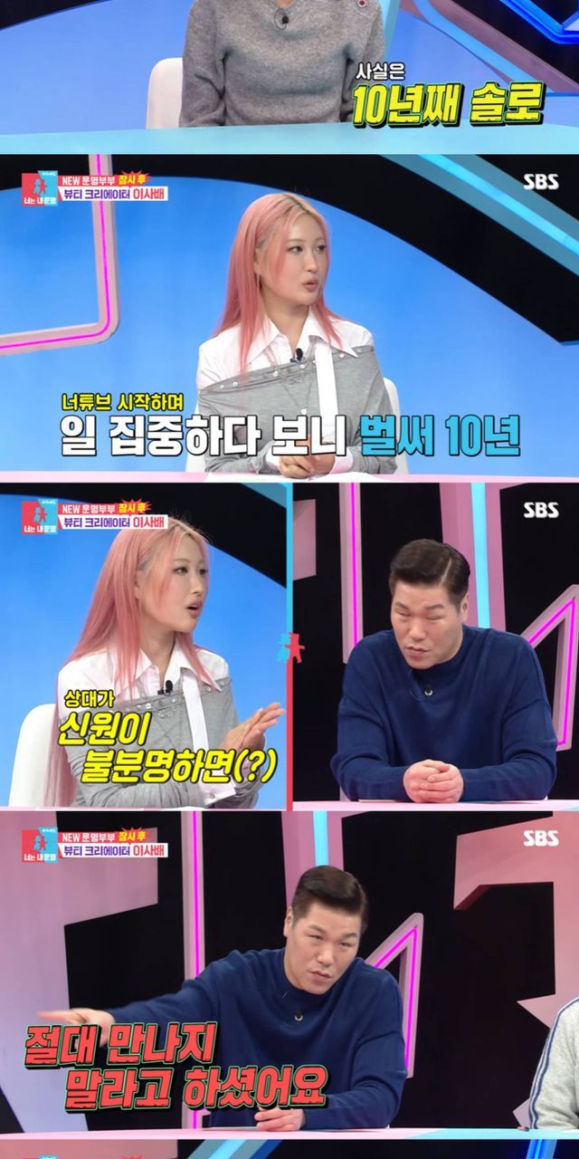 이사배는 10년째 솔로라고. 그는 "일에 몰두하고 싶고, 서장훈님께서 일단 누군지 모르면 신원이 불분명하면 절대 만나지 말라고 하셨다"라며 서장훈의 조언을 언급했다.