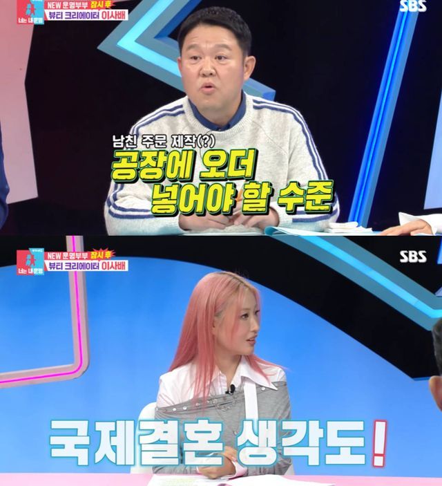 또 "드문드문 연락해야 하고 포토제닉 한 끼가 있어야 하고 솔직하고 현명한 리액션, 영어 잘하는 사람"이라며 김숙은 이사배의 이상형을 읽었고, 이내 포기해 웃음을 안겼다. "영어 잘하는 사람"이라는 이상형 조건에 MC들은 국제결혼을 물었고, 이사배는 "외국 분이면 좀 더 좋을 것 같다"고 답했다.