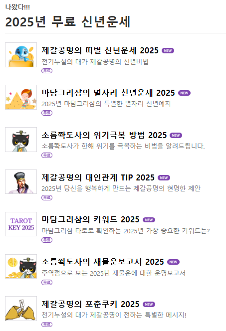 2025년 을사년을 맞이해 출시한 상품은 총 11개로 먼저 [소름쫙 신년운세 2025]는 명리 사주, 자미두수, 주역으로 나에게 일어날 모든 일을 점치고 부와 행운에 길로 인도하는 방안을 알려준다. 또한 [딱 맞춤 신년운세 2025]는 내 나이, 상황에 맞는 맞춤 신년운세이며, [소름쫙 토정비결 2025]는 상반기와 하반기의 개별풀이와 10개의 카테고리 해설이 담겨 있다. 뿐만 아니라, 냉정하고 솔직한 쪽집게 감정, 후련한 토정비결, 출사표 비책, 타로 예지, 핵심 분석 등 다양한 신년운세를 재밌게 점칠 수 있다.