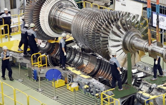 지난 2019년 9월 두산에너빌리티 직원들이 가스터빈 초도호기 최종조립을 위해 로터 블레이드를 케이싱에 설치하고 있다. ⓒ 두산에너빌리티