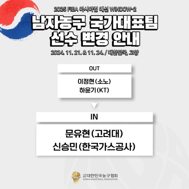 대한민국농구협회는 12일 오전 "협회는 2025 국제농구연맹(FIBA) 아시아컵 예선 윈도-2를 대비해 확정한 명단을 일부 변경했다. 이정현과 하윤기가 부상으로 하차했고, 문유현과 신승민이 첫 성인 국가대표로 이름을 올렸다"고 밝혔다.