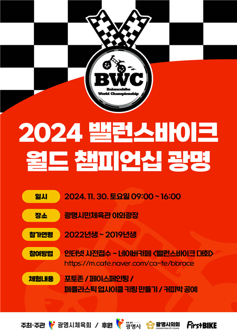 [포인트경제] 광명시체육회가 주최·주관하고 광명시·광명시의회·퍼스트바이크가 후원하는 '2024 밸런스바이크 월드 챔피언십 광명'이 오는 30일 오전 9시부터 오후 4시까지 광명시민체육관 야외광장에서 개최된다.