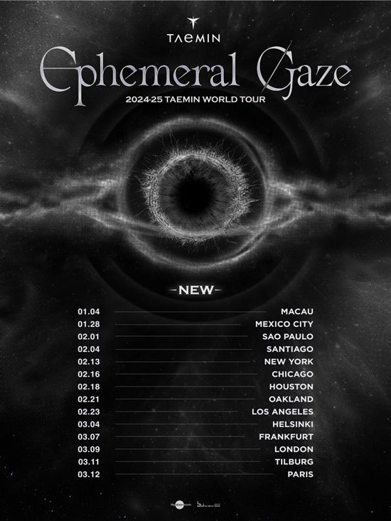 12일 소속사 빅플래닛메이드엔터에 따르면, 종합 아티스트 IP 플랫폼 원더월·프롬을 운영하고 있는 노머스가 내년 2월 13일 뉴욕을 시작으로 시카고(2월 16일), 휴스턴(2월 18일), 오클랜드(2월 21일), 로스앤젤레스(2월 23일) 등 미주 5개 도시에서 열리는 태민의 2024-25 월드투어 'Ephemeral Gaze(이페머럴 게이즈)'를 공연 제작사 밝은누리와 함께 진행한다.