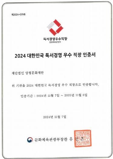 [와이뉴스] 양평문화재단이 올해 문화체육관광부와 한국출판문화산업진흥원이 주관하는 '독서경영 우수직장 인증'을 획득했다. 이번 인증은 재단이 직장 내 독서 문화 활성화와 직원의 독서 활동을 적극 장려하며 독서 친화적 환경을 조성한 점을 높이 평가받아 이루어졌다.