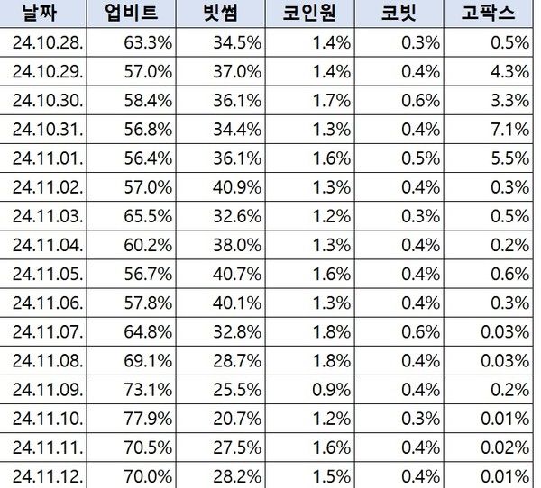 업비트와 빗썸의 점유율이 98% 이상을 차지하며 3~5위의 거래소들의 점유율은 2% 미만으로 떨어졌다.
