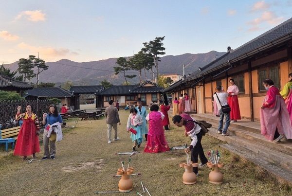증평 장이익어가는 마을을 찾은 중국인 관광객들이 한복을 입고 투호놀이를 하고 있다. / 증평군청