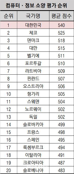 우리나라 학생들은 컴퓨터·정보 소양 평가에서 평균 540점을 받아 1위를 차지했다. 이어 △체코(525점) △덴마크(518점) △대만(515점) △벨기에(511점) △포르투갈(510점) △라트비아(509점) △핀란드(507점) △오스트리아(506점) △헝가리(505점)가 그 뒤를 이었다. 컴퓨터·정보 소양 평가에서 34개국 평균 점수는 476점에 그쳤다. 우리나라는 평균보다 64점 높았다.