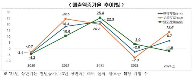 13일 한국경제인협회가 사업보고서 제출대상 법인 814개사의 경영성과를 분석한 결과 올해 상반기 분석 대상 기업의 매출액은 전년 동기 대비 6.7% 증가했다. 이는 다만 수출기업의 매출액 증가(13.6%)에 따른 것으로, 내수기업의 매출액 증가율은 2020년 이후 처음으로 마이너스(-1.9%)를 기록했다.