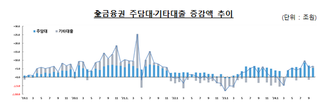 2024년 10월, 전 금융권 가계대출이 6.6조원 증가하며 전월(5.3조원) 대비 증가폭이 확대되었다. 금융위원회는 이러한 증가세에 대해 경계감을 표하며, 강화된 가계부채 관리기조를 유지하는 동시에 서민·취약계층의 자금 애로를 해소하기 위한 노력을 병행할 것이라고 밝혔다.