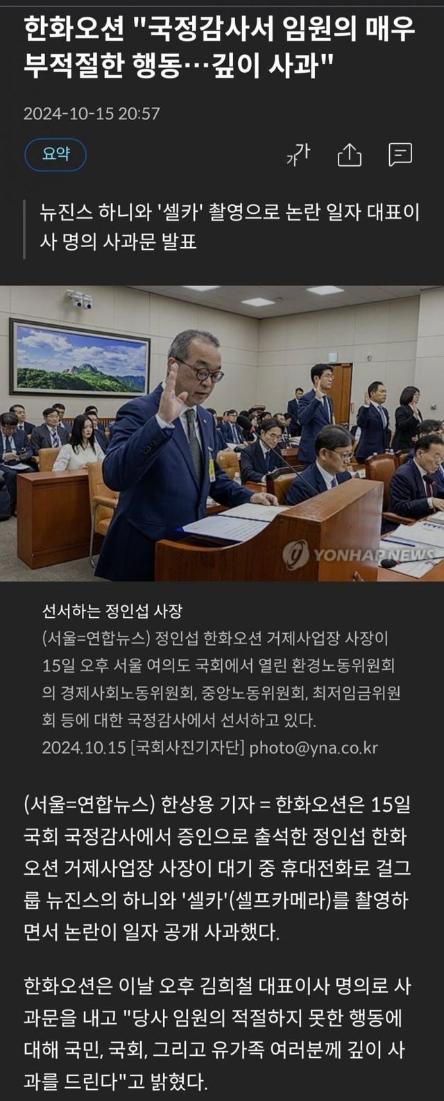 뉴진스 하니와 '셀카' 촬영으로 논란 일자 대표이사 명의 사과문 발표