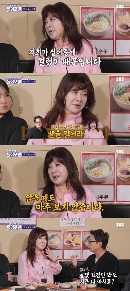 노사연은 "말을 잃어야 한다. 또 생존 근육이 있듯이 생존 언어면 족하다"며 "저희는 앉아도 옆으로 앉지 마주보지 않는다"고 너스레를 떨었다.
