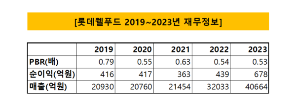롯데웰푸드 연간 PBR은 ▲0.79배(2019년) ▲0.55배(2020년) ▲0.63배(2021년) ▲0.54배(2022년) ▲0.53배(2023년)를 기록했다. 비교기업 평균(0.8~1.3배)과 비교해 시장에서 저평가됐다고 볼 수 있다.