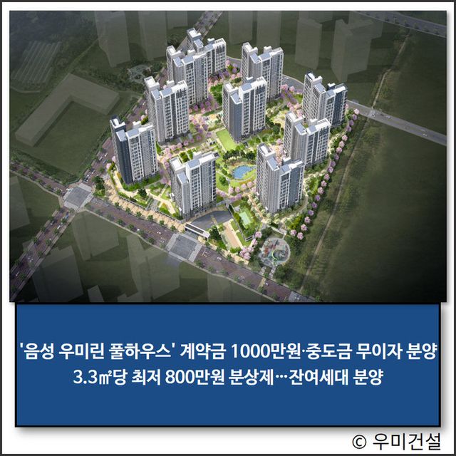 우미건설이 충북 음성에 들어서는 '음성 우미린 풀하우스'에 대해 계약금 정액제, 중도금 무이자 대출을 적용하며 잔여 세대 분양에 나섰다.