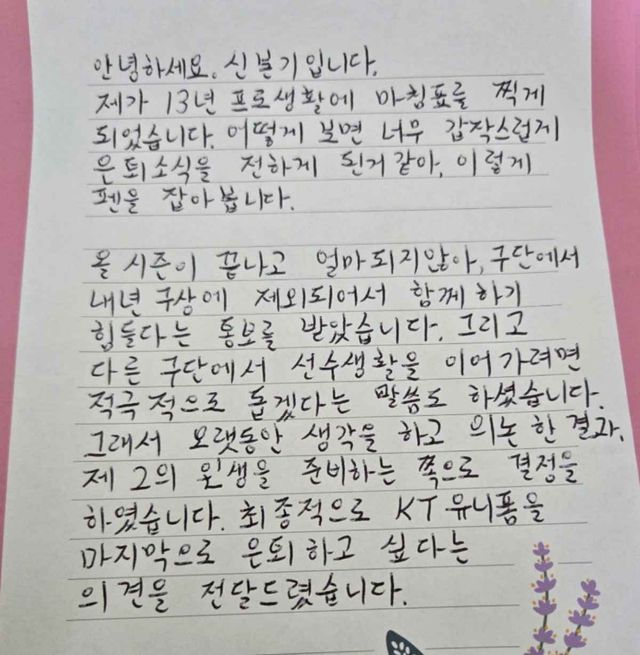 은퇴 소식 전하는 신본기 손편지 1. / 신본기 인스타그램