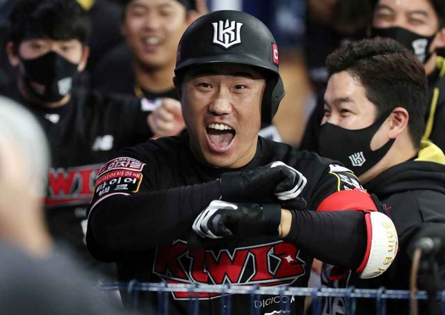 2021년 11월 18일 오후 서울 구로구 고척스카이돔에서 열린 '2021 신한은행 쏠 KBO 한국시리즈’ 4차전 KT 위즈와 두산 베어스의 경기 5회초 무사 주자 없는 상황 KT 신본기가 솔로홈런을 치고 환호하고 있다. / 뉴스1