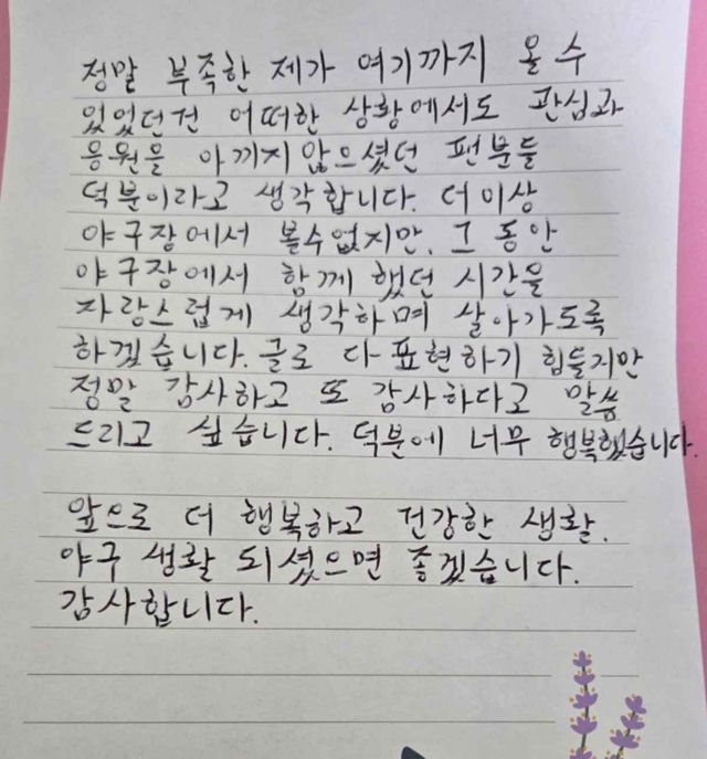 정말 부족한 제가 여기까지 올수있었던건 어떠한 상황에서도 관심과 응원을 아끼지앓으셨던 팬분들 덕분이라고 생각합니다.더이상 야구장에서 볼수없지만, 그 동안 야구장에서 함께 했던 시간을 자랑스럽게 생각하며 살아가도록 하겠습니다.글로 다 표현하기 힘들지만 정말 감사하고 또 감사하다고 말씀드리고 싶습니다.덕분에 너무 행복했습니다.