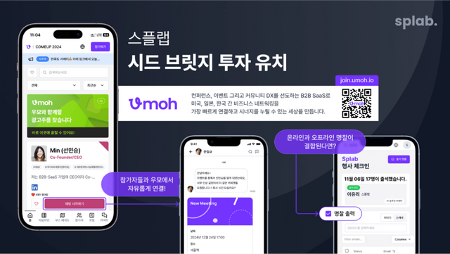 정인오 포스텍홀딩스 심사역은 “스플랩은 긴 시간 지켜봐온 과정에서 항상 시장의 기회를 찾으려는 부지런함과 빠른 실행력을 보여준 기업”이라며 “이러한 노력 끝에 탄생한 서비스 우모가 MICE 산업 현장의 애로사항을 해결하며, 다수의 고객들로부터 깊은 사랑과 신뢰를 얻고 있는 모습이 투자를 진행하게 된 결정적 계기”라고 전했다.