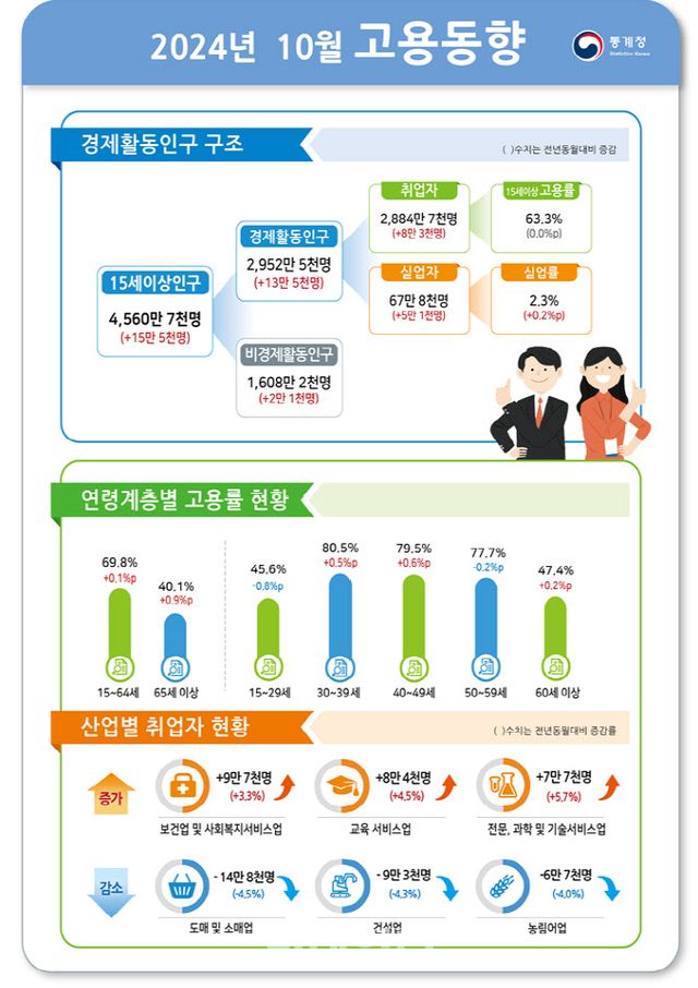 15세 이상 고용률은 63.3%로 1년 전과 동일했다. 경제협력개발기구(OECD) 비교 기준인 15~64세 고용률은 69.8%로 전년 동월 대비 0.1%포인트 상승했다. 1989년 관련 통계 작성 이래 10월 기준 가장 높은 수준이다. 청년층(15~29세) 고용률은 45.6%로, 전년 동월 대비 0.8%포인트 하락했다.