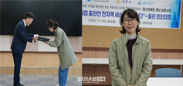 | ▲ 대상을 차지한 이정화 씨에게 상을 수여하는 아라소프트(주) 강정현 대표 및 전자출판경진대회에서 대상을 차지한 이정화 씨 |