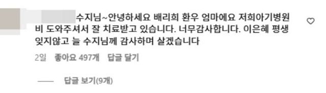 A씨는 “저희 아기 병원비 도와주셔서 잘 치료받고 있다. 너무 감사하다”며 “이 은혜 평생 잊지않고 늘 수지님께 감사하며 살겠다”고 적었다.