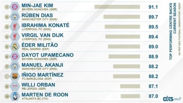 FIFA 산하 국제스포츠연구소(CIES)는 11일(현지시간) 공식 SNS를 통해 이번 시즌 뛰어난 모습을 보여주고 있는 센터백 순위를 공개했다.