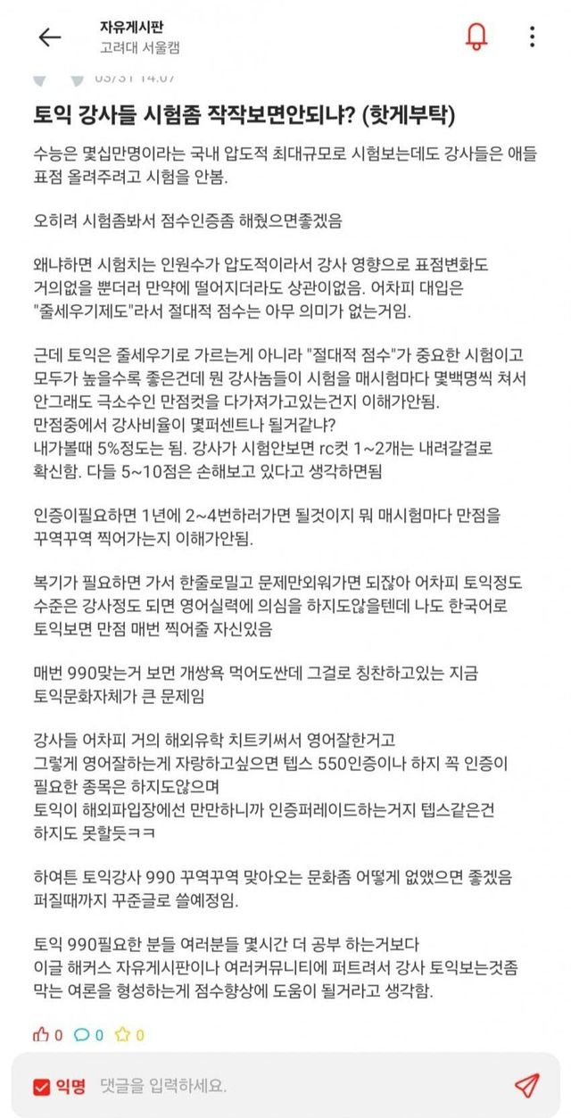 토익은 강사들이 매시험마다 몇백명이 시험봐서 응시생들이 피해봄