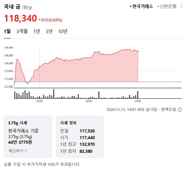 국내 금시세(금값)가 13일 오후 상승세(전 거래일 대비)를 보이고 있다.