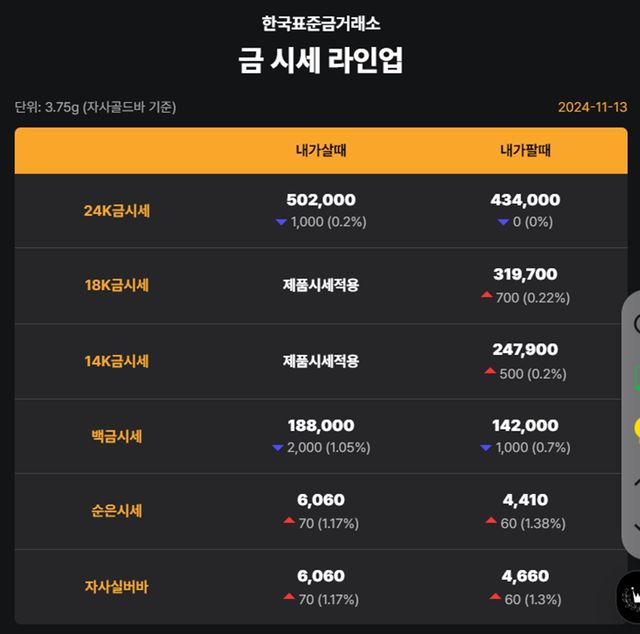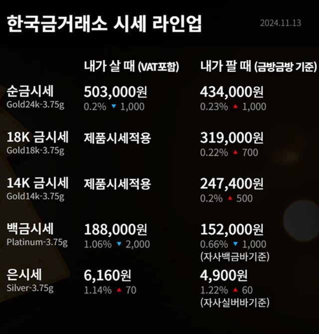 순금(24K) : 매입가 50만 3000원 / 매도가 43만 4000원