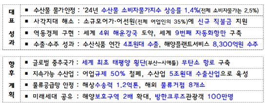 해수부는 윤석열 정부 후반기에도 각종 규제혁신을 통해 지속 가능한 수산업을 키우고, ‘글로벌 해양수산 중추국가’로 도약하겠다는 목표를 밝혔다. 이를 위해 2028년까지 현재 1500여개에 달하는 어업 규제의 절반을 철폐하고, 총어획량 기준으로 어업을 관리하는 체계로 전환한다. 또 2027년 태평양을 탄소 배출 없이 항해하는 ‘녹색해운항로’를 세계 최초로 구축하는 등 해운 분야 탈탄소 주권 선점도 노린다.