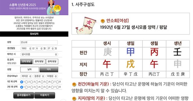 이처럼 원더걸스 소희의 연애가 집중되는 가운데 그녀의 사주를 통해 내년에는 연애 혹은 결혼을 할 수 있을지 살펴보았다. 온라인 사주 전품 플랫폼 '위키사주'에 따르면 2025년에는 상대가 문을 활짝 열고 기다리고 있다. 좋아하는 이성 때문에 크게 웃을 운세이다. 행복한 나날을 보내게 되며 매력이 넘치고 자신감도 충만할 때이니 모든 것이 원활하게 풀리게 된다. 높은 지위 또는 명문가와 인연이 있어 맺어지며 순조롭게 결혼이 진행될 운이기에 기다렸던 보람을 느끼게 된다. 2025년은 애정운과 이성운이 아주 좋은해로 특별히 노력하지 않아도 주변에 이성이 많이 모이게 되는 형상을 보인다. 1, 4, 8, 10월에 애정운이 특히 좋다.
