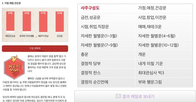 온라인 사주 전문 사이트 '위키사주'는 오랜 전통을 바탕으로 한 사주팔자와 현대적인 분석 기술을 결합하여 각자의 운명을 상세히 분석한다. 이름과 생년월일, 태어난 시간과 성별을 입력하면 간단하게 이용할 수 있다. 특히, 앞으로 3년 동안의 애정을 꿰뚫어볼 수 있는 애정운, 냉정하고 속시원한 궁합, 사랑에 관한 모든 것을 담은 타로까지 다양한 운세를 재미있게 점칠 수 있다.