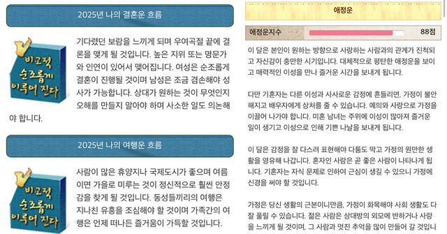'소름쫙신년운세 2025'에서는 나의 사주구성도 뿐만아니라, 가정, 애정, 건강운, 금전, 성공운, 사업, 창업, 이전, 시험, 취업, 직장, 매매, 재테크운부터 자세한 월별운, 총운, 개운, 당부, 기운, 찬스, 행운의 그램까지 상세하게 나와있다.