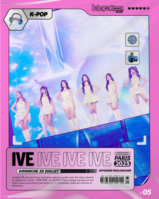 '롤라팔루자'는 1991년 미국 시카고에서 시작된 대규모 음악 축제로 미국, 프랑스, 칠레, 브라질 등 세계 여러 지역에서 개최되고 있다. 내년 7월 펼쳐지는 '롤라팔루자 파리'는 약 6만 5000명 규모의 대형 공연장에서 진행되며, 아이브는 해외 가수 저스틴 팀버레이크(Justin Timberlake), 템스(Tems), 조 드웨트 필레(Joe Dwet File)와 함께 여름밤을 뜨겁게 달군다.