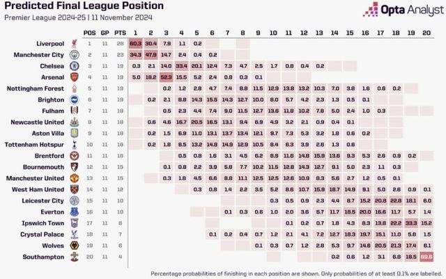 축구 통계 업체 ‘옵타’는 12일(한국시간) “2024~25시즌 EPL 타이틀은 누가 차지할까”라며 슈퍼컴퓨터의 예측을 공개했다.