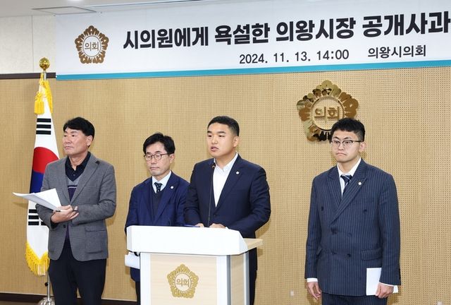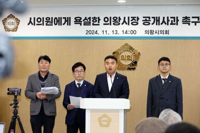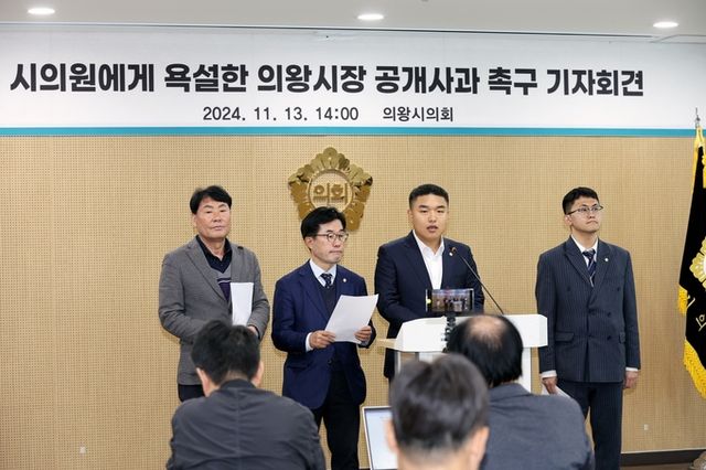 의왕시의회 한채훈, 박현호, 서창수, 김태흥 의원 등은 13일 오후 의회 중회의실에서 기자회견을 통해 “민의를 대변하는 기관인 지방의회의 의원이 5분 발언을 통해 시장이 설령 듣기 싫은 소리를 했다고 하더라도 주민대표인 의원을 향해 욕설을 한 것은 시장이 주민을 욕한 것과 다름없다”며 “시민 앞에 진심 어린 엄숙한 공개사과와 재발방지를 약속하라”고 촉구했다.