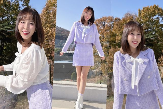 공개된 사진 속 신지는 화이트 블라우스에 라벤더 컬러 트위드 셋업을 입고 있는 모습이다. 생각보다 포근한 가을 날씨가 마음에 드는 듯 연신 밝은 미소를 짓고 있는 신지의 모습이 눈길을 사로잡는다. 특히 슬림한 몸매로 사랑스러운 의상을 소화한 신지의 비주얼이 보는 이를 매료한다.