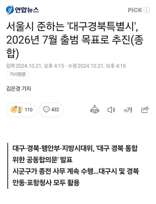 대구랑 경북이랑 행안부랑 이미 통합에 협의함