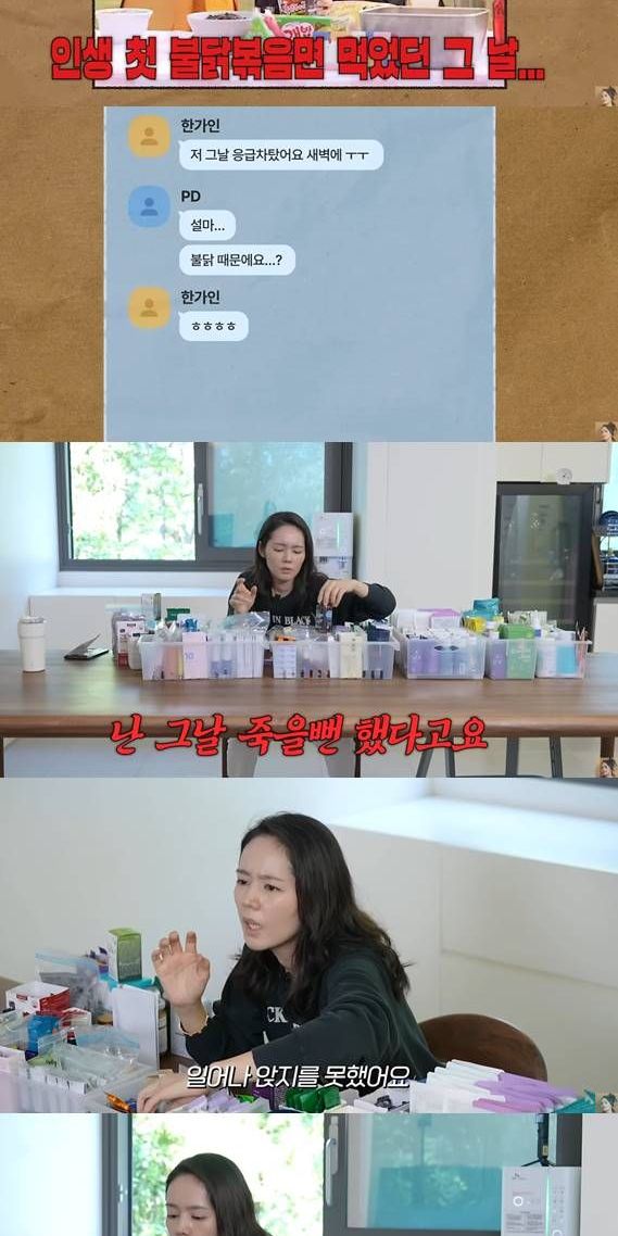 한가인은 "실려가서 위 검사했는데도 멀쩡하다. 난 그날 죽을 뻔 했다. 그 다음날 일어나 앉지를 못했다. 너무 아파서"라며 "소화가 1번이다. 매일 먹는 것"이라고 말했다.
