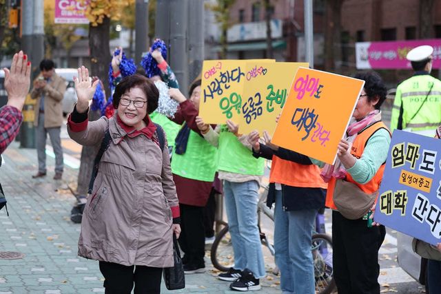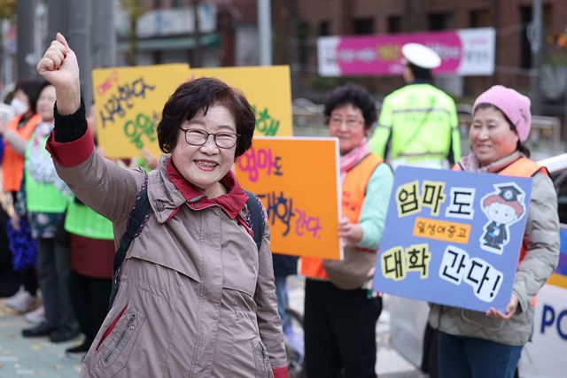 머리가 희끗한 후배들의 응원전 10대 고등학생들 못지않게 뜨거운 열기를 자랑했다. 이들은 '사랑한다, 응원한다', '붙어라! 철썩', '여보 등록금 준비해' 등 재치 넘치는 팻말을 들고 "엄마도 대학 간다"는 구호를 연신 외쳤다.