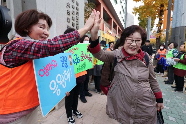 2025학년도 대학수학능력시험일인 14일 오전 서울시교육청 12지구 제22시험장인 마포구 홍익대학교사범대학부속여자고등학교에서 일성여자중고등학교 최고령 수험생 임태수(83) 할머니가 학우들의 응원을 받으며 시험장으로 향하고 있다. / 뉴스1