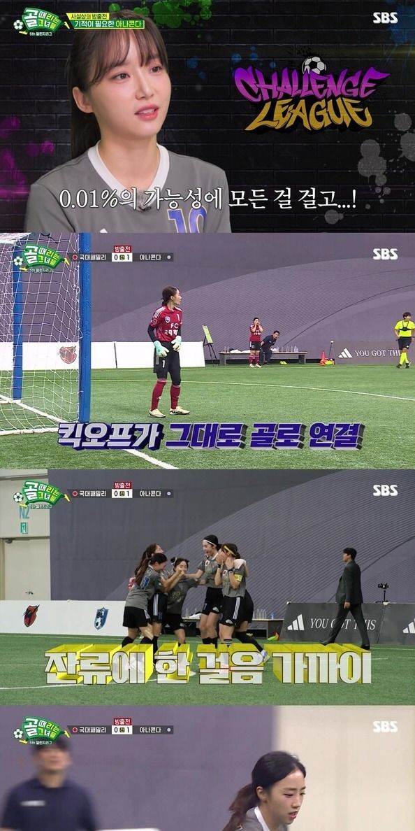 경기가 시작되고, 뜻밖의 선제골이 터졌다. ‘아나콘다’ 윤태진의 킥오프가 그대로 골로 연결되며 2초 만에 기적 같은 선제골이 나온 것. ‘골때녀’ 역사 상 최단 시간 득점으로 잔류에 한 발짝 다가간 ‘아나콘다’ 선수들은 폴짝폴짝 뛰며 기쁨을 표출했다. 허무하게 첫 골을 내준 ‘국대패밀리’ 선수들은 서로 ‘괜찮다’고 격려하며 멘탈을 다잡았다.